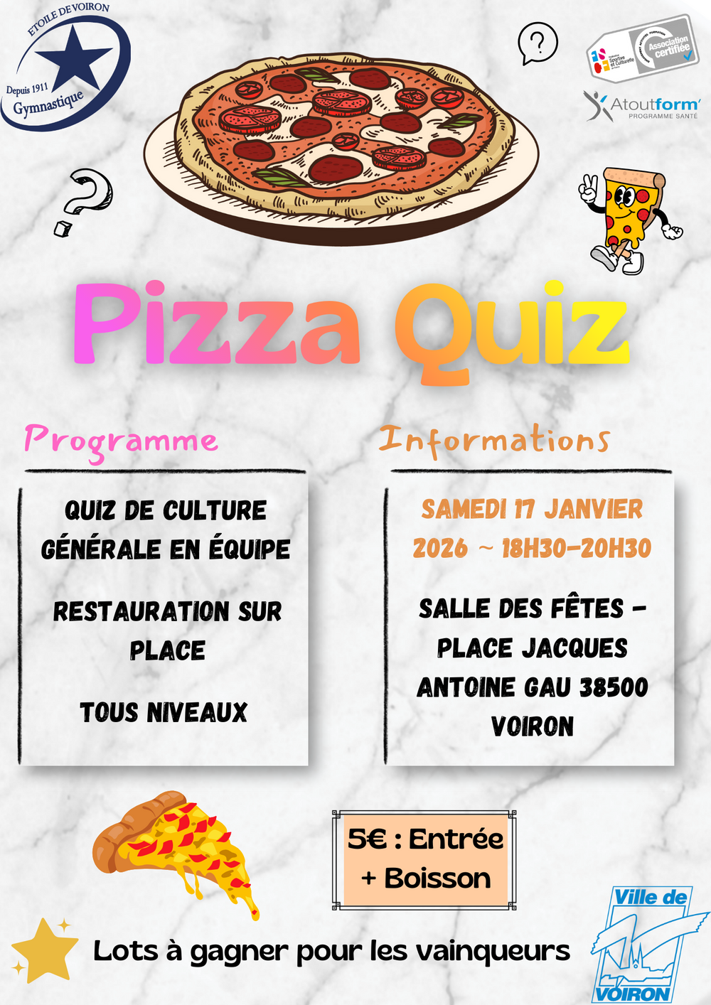 Envie d'une soirée quiz en dégustant des pizzas, rendez vous le samedi 17 janvier à partir de 18h30 à la salle des fêtes de Voiron ⭐️